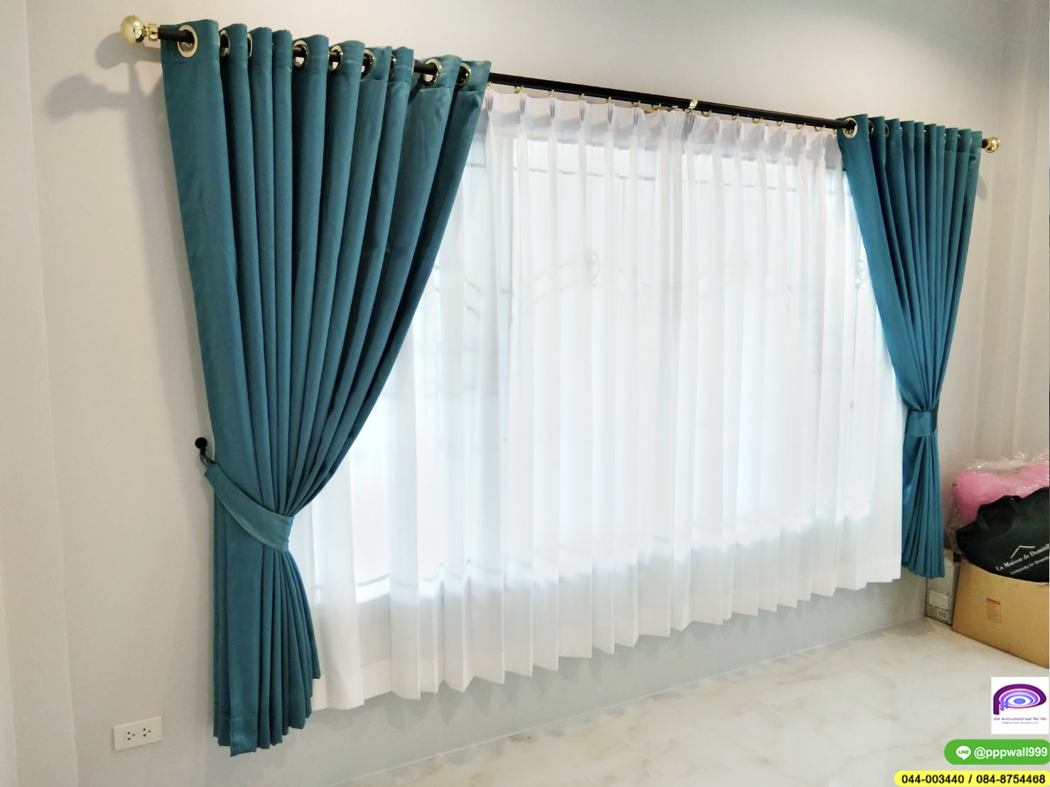 โดยแบบผ้าม่านที่ลูกค้าเลือก เป็นโทนสีเขียว เขียวน้ำทะเล สวยมาก ๆค่ะ