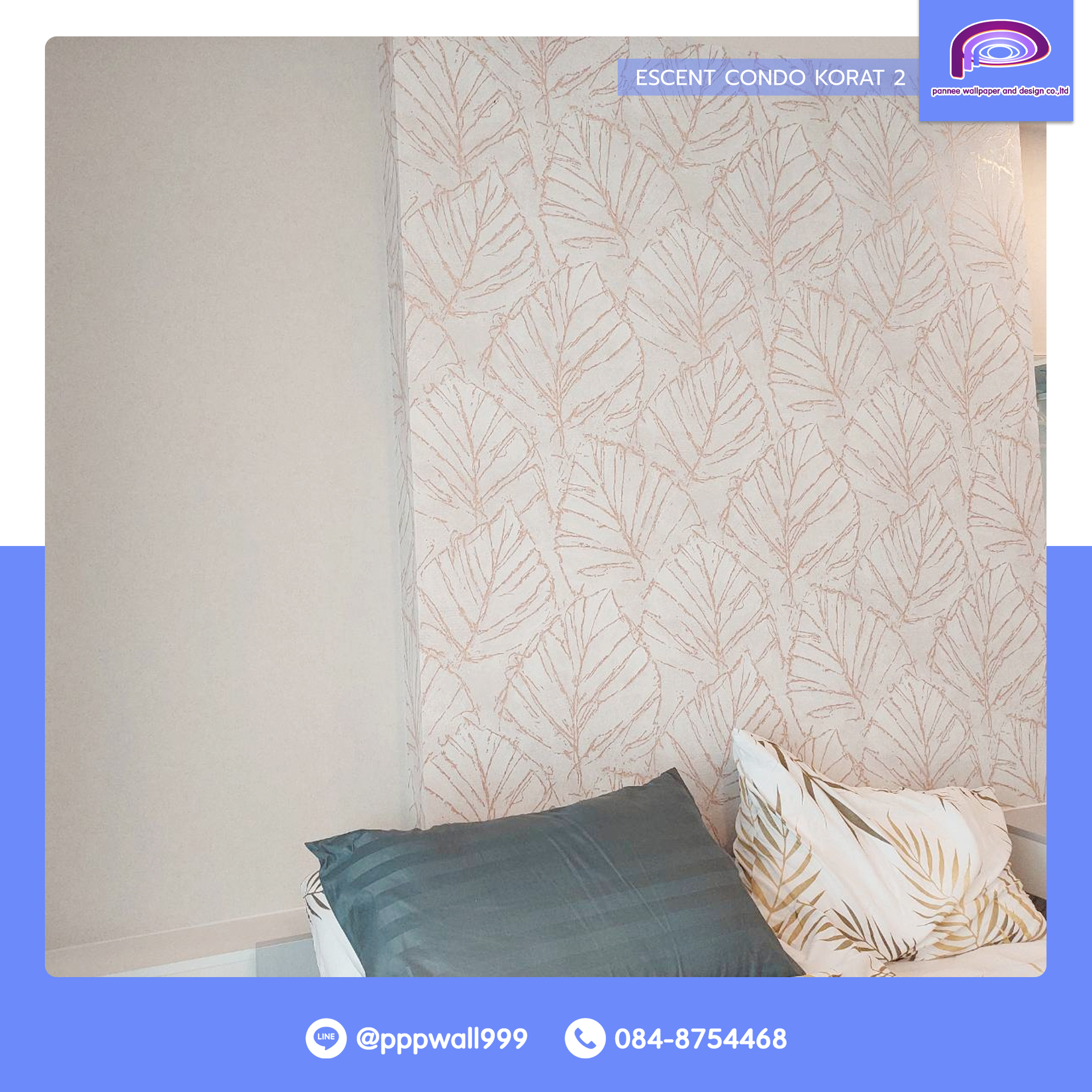 วอลล์เปเปอร์ห้องนอน ตกแต่งหัวเตียงโดเด่น ด้วยลายใบไม้ ขนาดใหญ่ สวยงาม เข้าคู่กันกับชุดผ้าม่านยูวี ทึบแสง 95% โทนสีอบอุ่น และผ้าโปร่งขาวสบาย ๆ เหมาะสำหรับห้องพักผ่อนที่เป็นคุณที่สุดเลยค่ะ